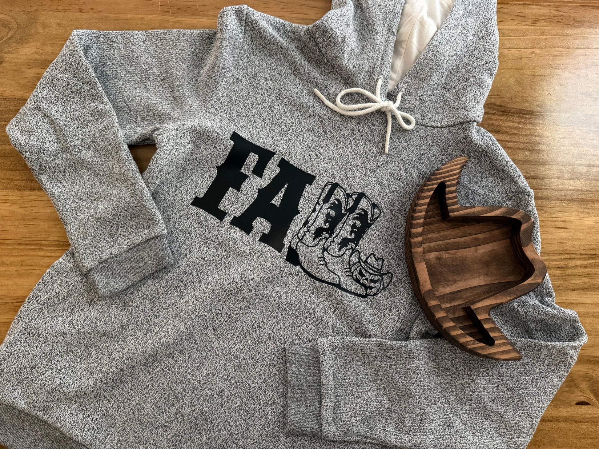 Wrap yourself in comfort and western charm with this heather gray fleece hoodie. Featuring bold black lettering with a rustic cowboy boot design, it’s the perfect way to show your love for FALL in true country style.