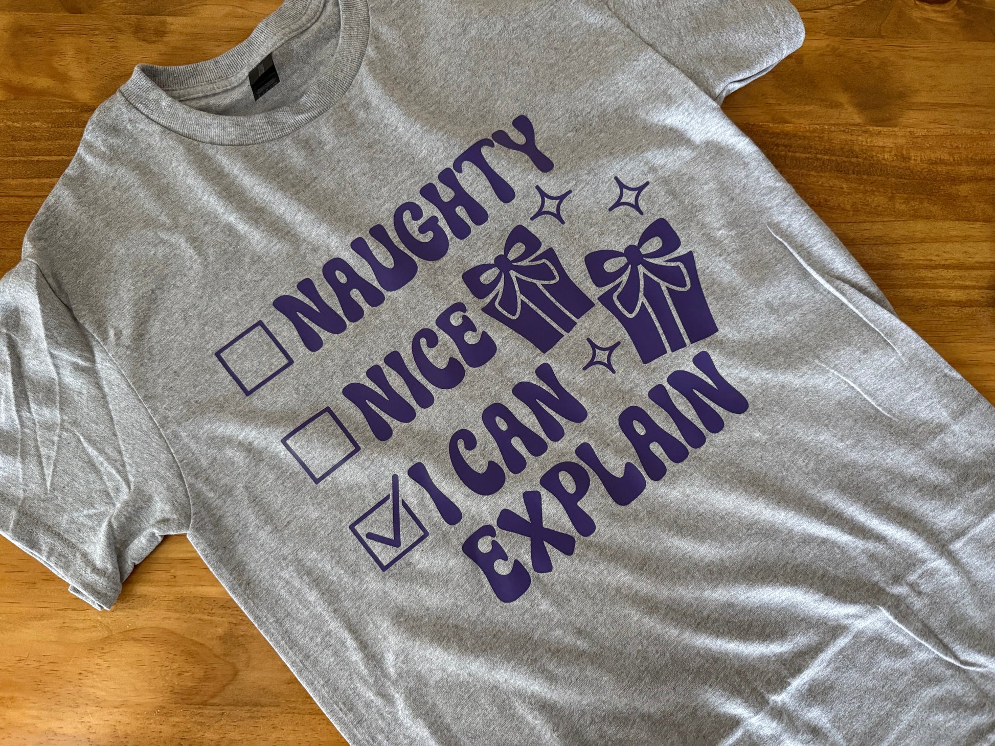 ‘Tis the season for laughter and a little bit of mischief! Our I Can Explain Christmas tee adds the perfect dose of humor to your holiday wardrobe. Featuring a playful checklist — Naughty, Nice, and “I Can Explain” (checked, of course!) — in bold purple lettering on a soft heather gray tee, this shirt is made for all your festive fun.
