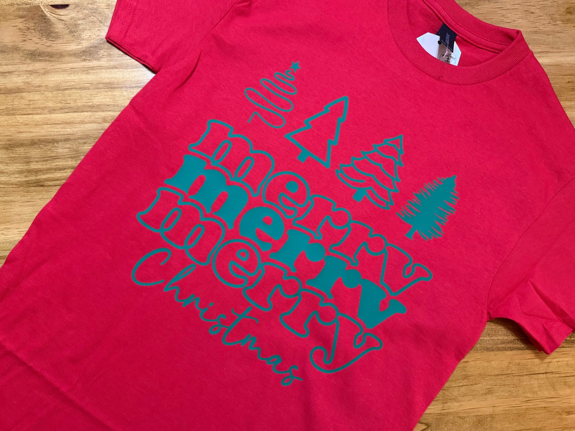 Bring all the festive cheer with our Merry Merry Merry Christmas tee! Featuring bold, stacked lettering and whimsical Christmas trees, this fun and bright design is perfect for celebrating the holiday season in style. Cozy, cheerful, and made for all your merry moments — from Christmas tree farms and cookie baking to family gatherings and holiday photos.
