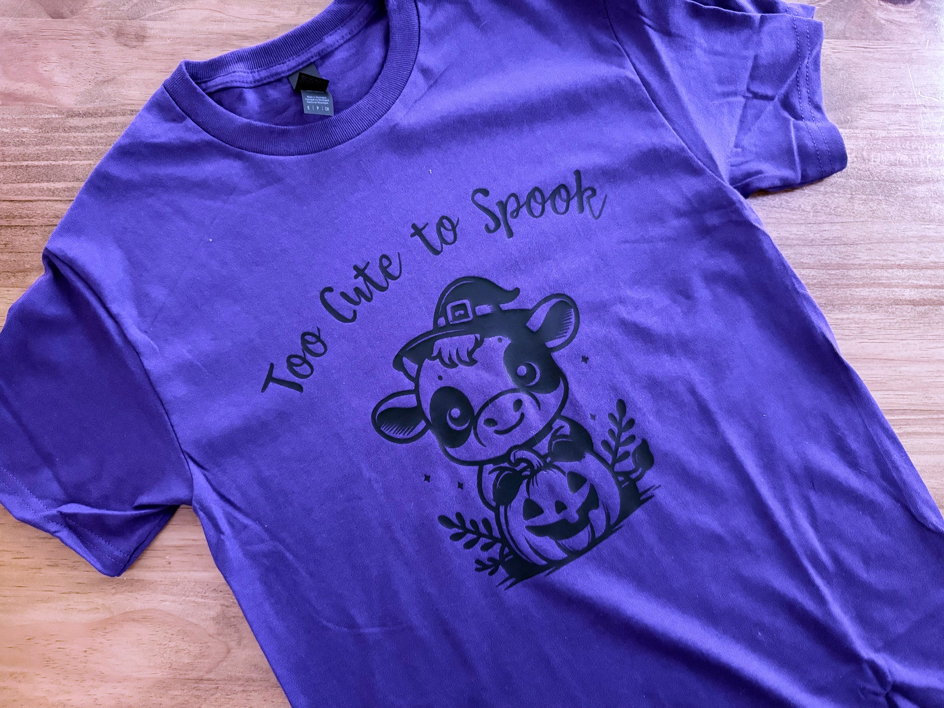 This one’s for the cuties who love spooky season but keep it sweet! Our Too Cute to Spook tee features an adorable cow dressed for Halloween, complete with a jack-o’-lantern and festive details. Printed in sleek black lettering and design on a dark purple tee, it’s the perfect mix of cute, cozy, and seasonal fun.