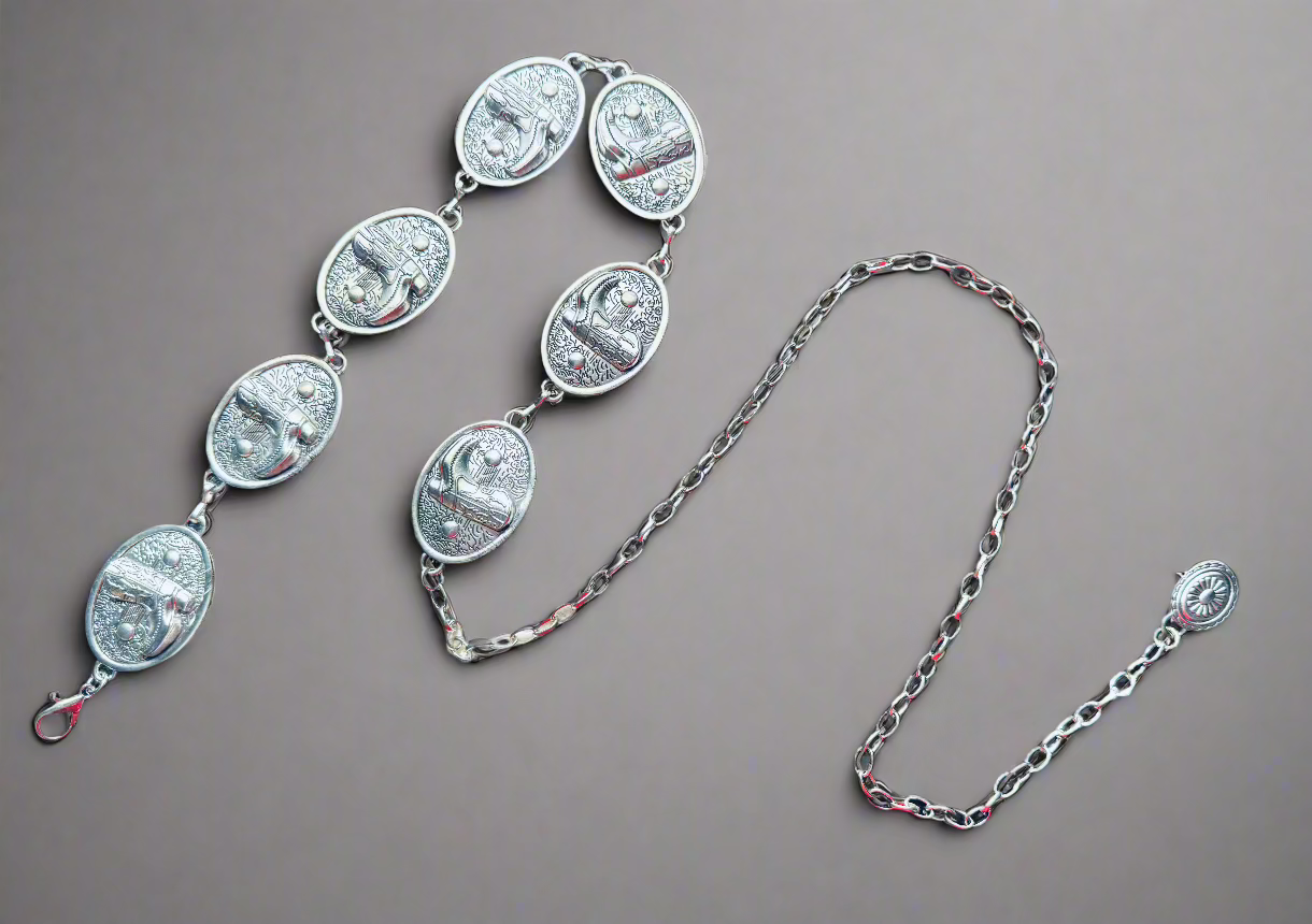Make a bold statement with our Western Cowboy Boot Concho Belt! Featuring intricately detailed cowboy boot conchos adorned with silver accents, this belt blends rustic charm with western flair. The silver-tone metal finish and adjustable chain closure ensure both style and comfort, making it the perfect accessory to cinch dresses, elevate denim looks, or add personality to your favorite outfit.