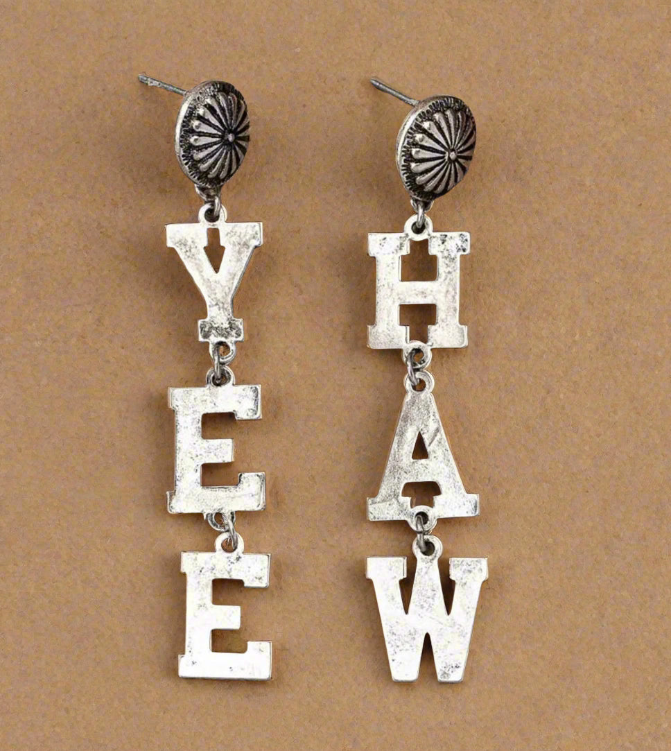 Make a bold western statement with these fun YEE HAW dangle earrings! Featuring antique silver-tone letters that spell out the classic cowboy phrase, these earrings are perfect for rodeos, concerts, line dancing nights, or anytime you want to show off your country roots.